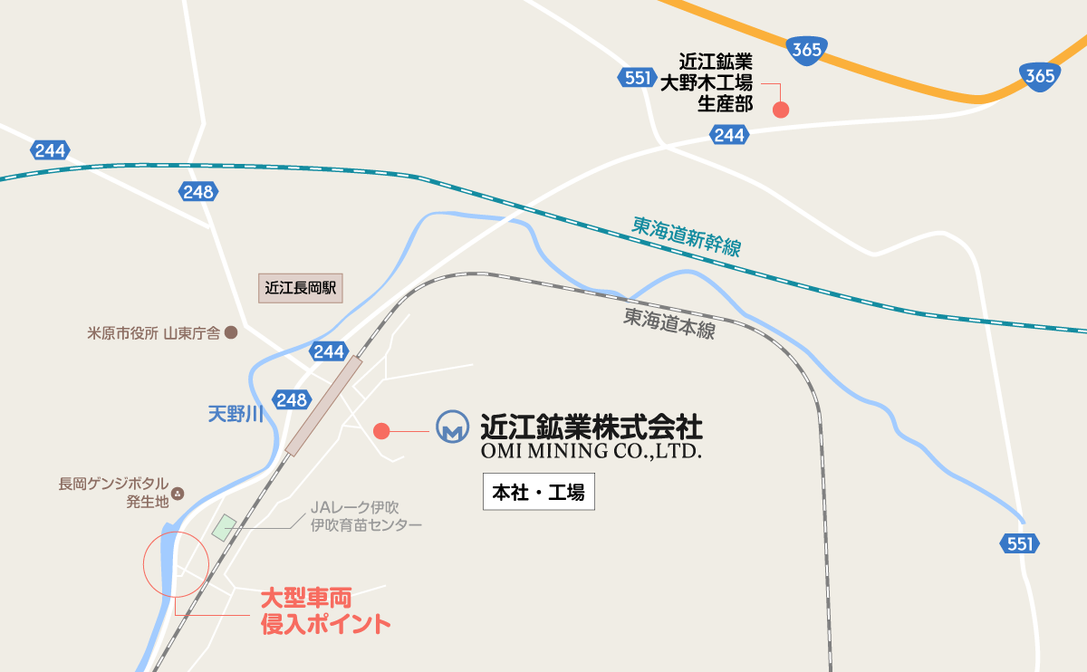 県道248号線から弊社へお越しになる際は、JAレーク伊吹様 伊吹育苗センターが目印となります。進入ポイントには電柱の上部に弊社案内看板が目印として設置してありますので、併せてご参照下さい。(右図の地図はクリックで拡大します)